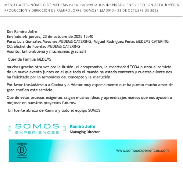 Menú Gastronómico de Medems para 150 invitados inspirado en colección de alta joyería Producción y Dirección de Ramiro Jofre SOMOS - Madrid 23 octubre de 2025