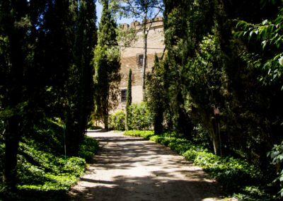 El jardín del Castillo, es del más puro estilo italiano, con altos cipreses y pinos mediterráneos, terrazas, setos y su imponente piscina.